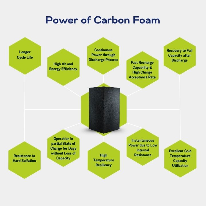 Firefly “Oasis” battery, made using MicrocellTM Carbon Foam technology, delivers the best in class performance compared to conventional Lead Acid and premium batteries.