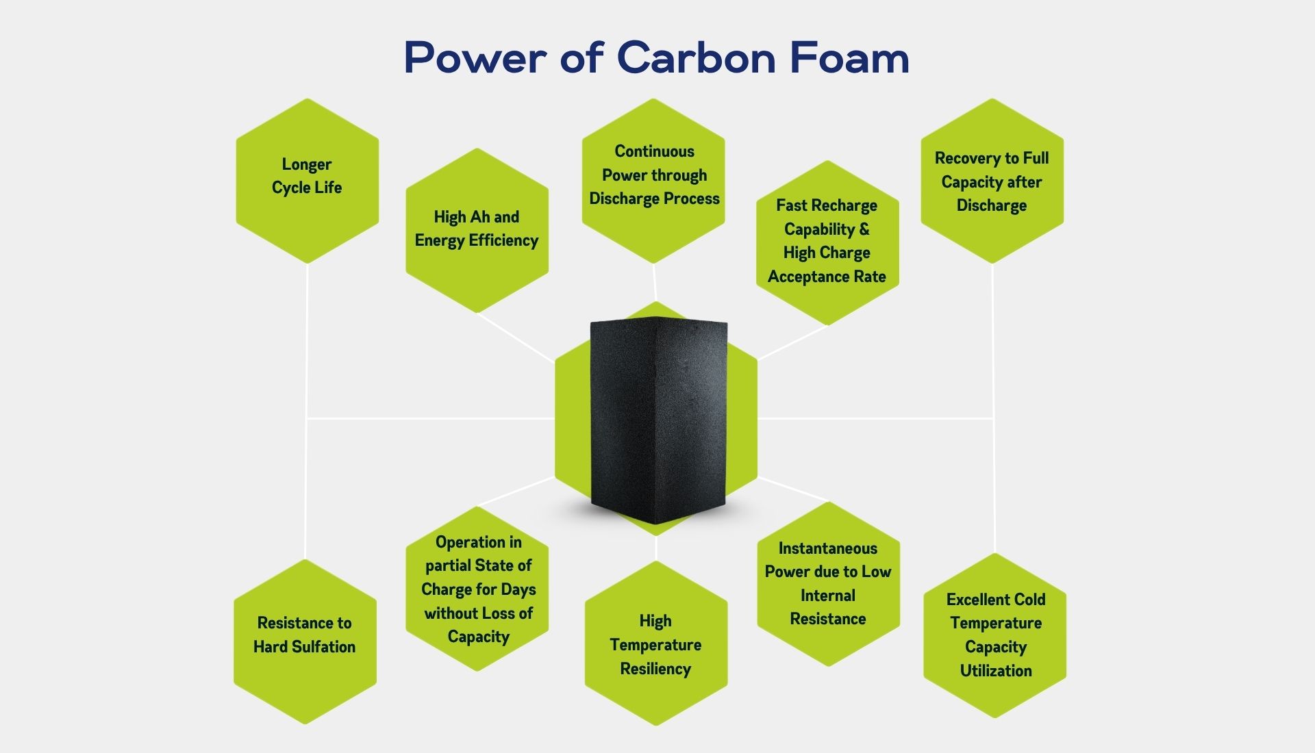 Firefly technology is an innovative material science that removes almost all limitations of current Lead Acid Battery Products. Carbon Foam is an Aero-Space Age material. It is a Composite made of high purity carbon carrying material. It’s used in nozzles of missiles and other energy absorbing applications. It’s bulk density is very low, below 0.04 g/cc and porosity is above 90%.