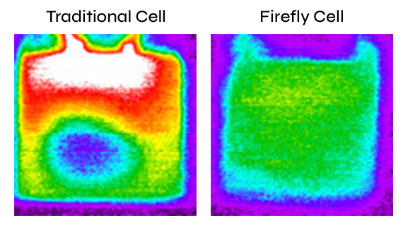Infrared images snapped at the end of a 5C (12 minute) discharge of both Firefly cell and a traditional cell. More uniform temperature distribution means: